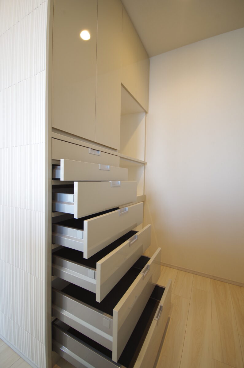 リビングテレビボード、ダイニング収納、キッチンバックボードは全て色を揃えて空間に統一感を持たせました。ベッドルームはベッド配置に合わせて収納とコンセントなども配置。壁面のエコカラット施工や玄関のタイル施工、エントランスのミラーまで内装をトータルで提案施工させていただきました。